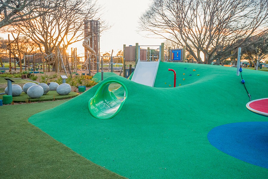 Margaret Mahy Family Park in Christchurch is a multi-million dollar destination playground that boasts a multitude of play options including; a splash zone, pour’n’play ‘hills’, a four-meter wide slide, double flying fox, sandpit, climbing nets, trampolines, tunnels, and an 8-metre high tower with a spiral slide.