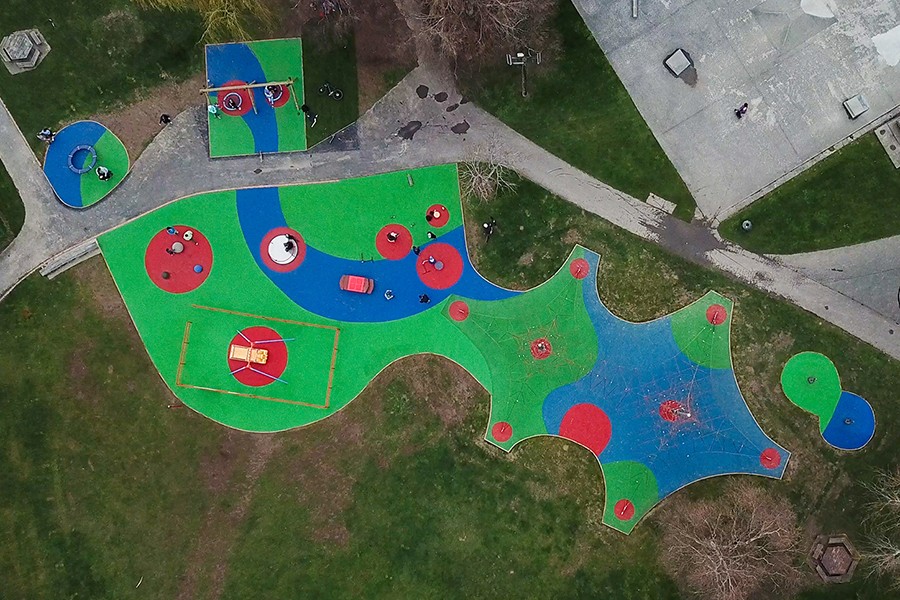 This brand-new playground is at the top of our list because of its bright colours and recent installation. The design of the playground reflects the history of the area where strawberry fields were once the main attraction. Numat installed the surfacing for this project as well as the colourful balls acting as berries scattered throughout the space.